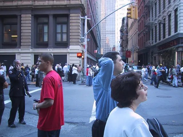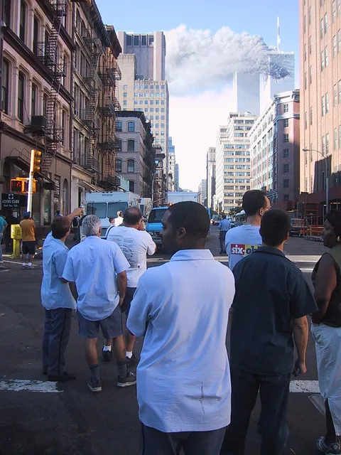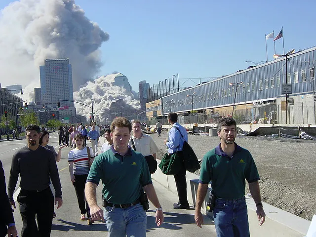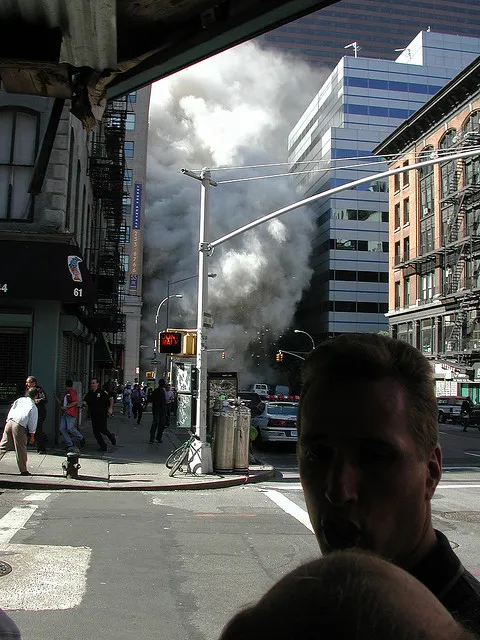عکاس: شاینا مارکز. پدرش این عکس را در حساب فلیکر خود گذاشته و میگوید: «این خیابان ششم است و اصلاً ترافیکی نداشت. فقط عابرانی که تازه متوجه شده بودند برج اول فرو ریخته.»