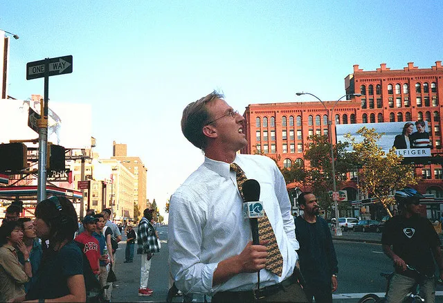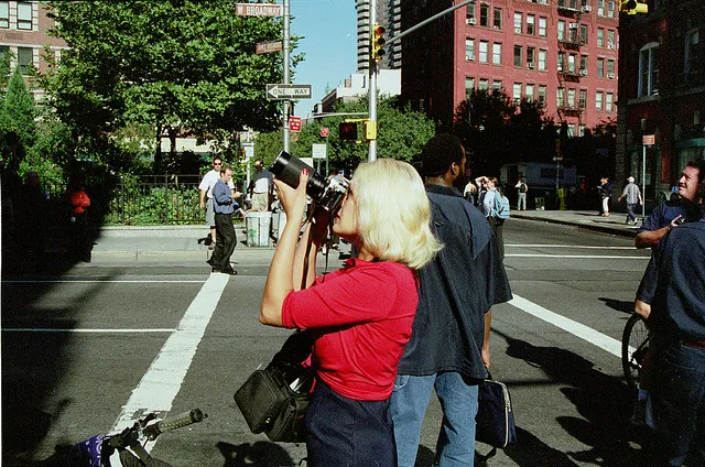 عکاس: هاروی سیلکوویتز در خیابان هیوستون محله گرینویچ. «یک گزارشگر تلویزیونی از شهر دیگری که در حال پوشش تراژدی ۱۱ سپتامبر است، به دود متصاعد شده از ویرانیهای مرکز تجارت جهانی در چند مایلی جنوبی نگاه میکند. این عکس در دوران پیش از دیجیتال من گرفته شده و به دلایلی روی سیدی رایت شده بود وقتی فیلم را ظاهر کردم.»
